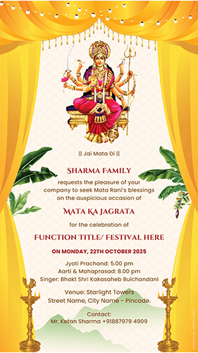 Mata Ka Jagran Invitation Card Online admin2025-09-04T21:15:51+05:30September 4th, 2025| Share This Story, Choose Your Platform! FacebookXRedditLinkedInTumblrPinterestVkEmail