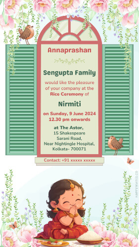 Celebrate your little one’s milestone with our Latest Annaprashan Invitation Template Card! Designed with elegance and simplicity, this template shows beautiful flower veils swaying on old ancient window with an adorable Bengali attire baby feeding rice for the first time, setting the perfect tone for your special occasion.