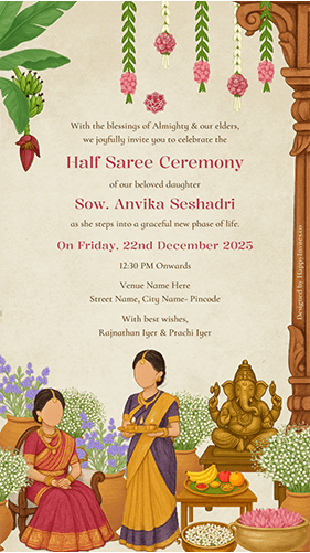 Mark the milestone of grace and womanhood with this Half Saree Invitation Card Design — a perfect blend of cultural charm and modern artistry. This digital invitation celebrates the cherished Langa Voni ceremony, symbolizing the beautiful transition into womanhood. Adorned with floral motifs, gold accents, traditional jewelry elements, and soft pastel hues, it reflects the richness of South Indian heritage in a classy, minimal way.