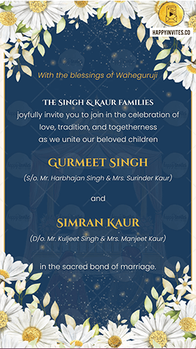 Graceful pastel floral patterns symbolizing love and purity. Khanda and Ek Onkar motifs for a spiritual Sikh touch. Editable details for multiple events – from Mehndi to Reception. Share instantly on WhatsApp, Instagram, or YouTube. Available in high-resolution formats for print and digital use. Perfect for couples who want a Sikh wedding invitation that feels traditional yet timelessly modern.