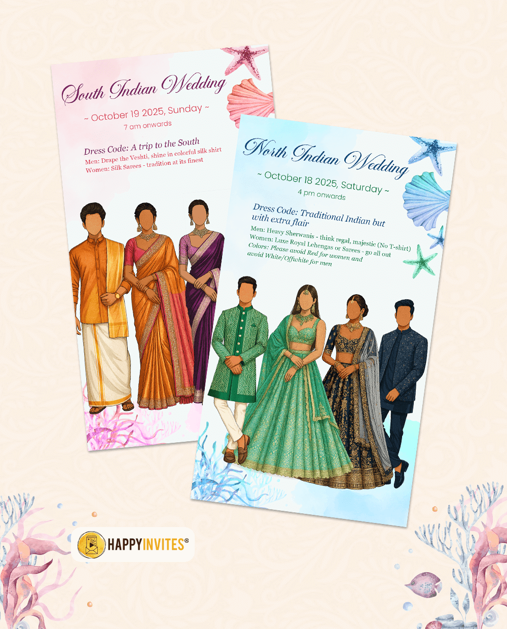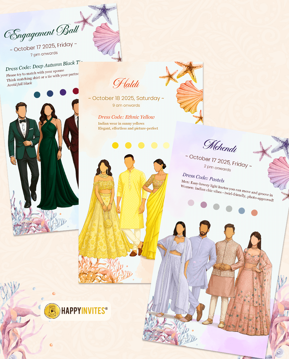 Perfect for destination weddings, this wardrobe planner ensures guests look stylish, coordinated, and celebration-ready while embracing the charm of an Indian beach wedding.